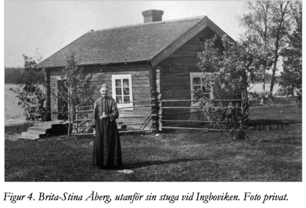 Ett äldre odaterat fotografi föreställer Brita-Stina Åberg och hennes stugavid Ingboviken (fig. 4). Vid närstudier av fotografiet och den på platsen stående byggnaden är det tydligt att dessa skiljer sig åt. Fotografier överensstämmer sannolikt inte heller, avseende byggnadens form och placering, med den undersökta husgrunden. Troligen är det den nuvarande byggnaden som syns på bilden, men att den förändrats kraftigt efter att bilden togs. Huset har byggts till på längden, byggts på med en övervåning samt försetts med panel (jfr fig. 2–4). Åtminstone delar av detta skedde förmodligen på 1920-talet, efter Brita-Stinas död då dottern Emma och hennes man tog över huset (Ulf Karlsson, muntligen april 2022).