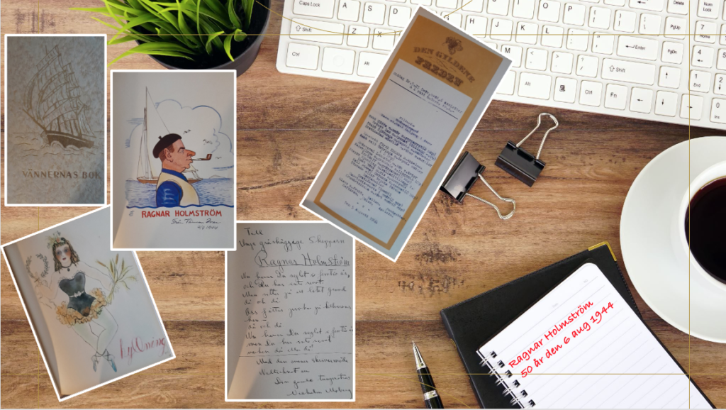 På loppis hittar jag idag ”Vännernas bok” – den innehåller reproduktioner av de personliga och mycket olikartade bidrag som en rad konstnärer av olika riktningar glatt författaren Ragnar Holmström, med på hans 50-årsdag den 6 augusti 1944. De träffades sannolikt ofta på ”Freden”.